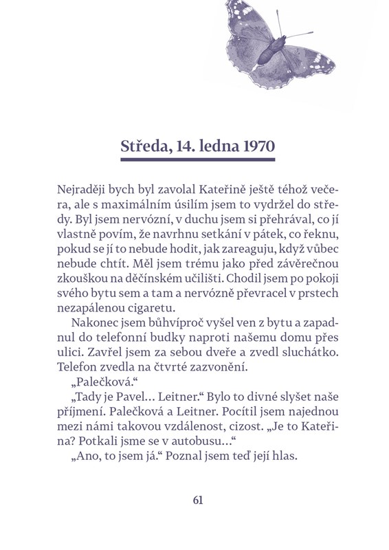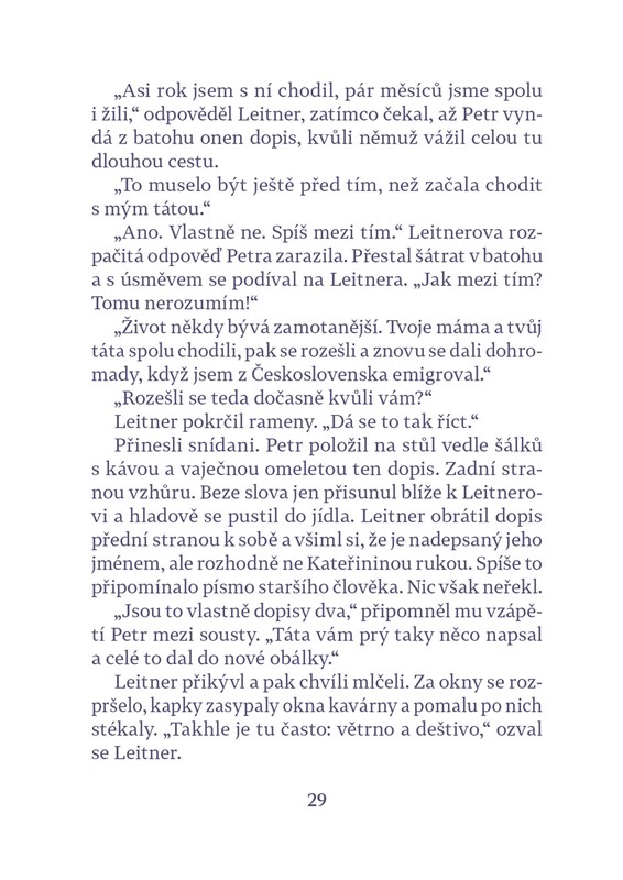 Pavel Leitner žije v nizozemském Leidenu, kam v roce 1970 emigroval z Československa. Patří mu antikvariát, společnost mu po rozpadu dlouholetého manželství dělá jen kocour. Jednoho dne jeho poklidný život naruší telefonát ze staré vlasti. Jakýsi mladík jménem Petr má pro něj dopis, který mu na smrtelné posteli svěřil otec, Leitnerův dávný známý. Událost stárnoucího antikváře uvrhne do víru vzpomínek – na mládí, na rodnou zemi a hlavně na krásnou Kateřinu, Petrovu maminku…