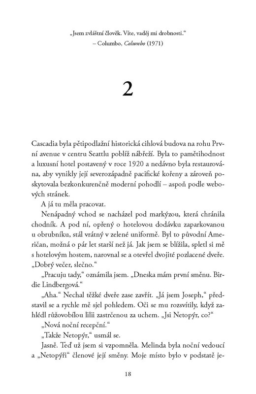 Birdie Lindbergová, milovnice detektivek, se po izolovaném životě s přísnými prarodiči vydává na letní brigádu v historickém hotelu v Seattlu. Doufá, že se v nové práci vymaní ze škatulky introvertního snílka. Na noční směně se setkává s Danielem Aokim, charismatickým řidičem hotelové dodávky, který se jí nabídne coby průvodce. Oba sdílí zálibu v tajemstvích a Daniel narazí na skutečnou záhadu – slavný samotářský spisovatel, kterého nikdy předtím neviděli na veřejnosti, se možná v hotelu s někým tajně schází.