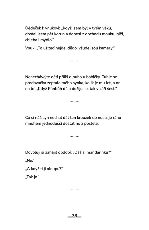 Říká se, že nové vtipy nevznikají. Omyl! S příchodem sociálních sítí k nám vtrhla armáda anonymních vtipálků, kteří notně osvěžili náš dvoreček zábavy. Pokud si nechcete přivodit zánět zápěstí věčným rolováním internetových stránek, sáhněte po této knize, kde jsme pro vás z lavin virtuálního humoru vykutali ty nejlepší fóry posledních let. Jak praví Charlie Chaplin: „Tento svět není světem radosti, proto je třeba v něm udržovat smích všemi silami.“ A jistý facebookový mudrc dodává: „Nikdy nepoužívejte záchod ve snu – je to past!“