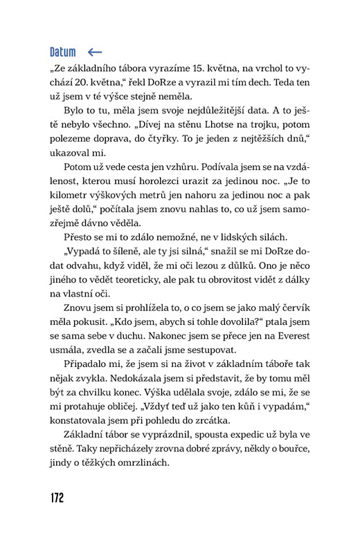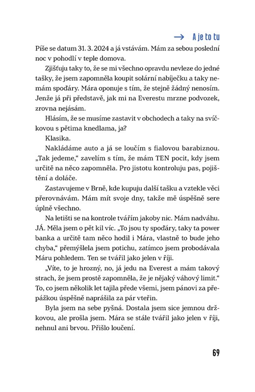 Jsem Monika, princezna se zlatým špuntem v zadku a taky obyčejná holka z Moravy. Nejsem horolezkyně ani cestovatelka. O svojí expedici na Mount Everest jsem snila celý život, deset let jsem trénovala a šetřila každou korunu. Stanula jsem na vrcholu, ale mnohem důležitější byla cesta – k hoře i k sobě sama. Nejsem zdravá, občas jsem bledou pacientkou v nemocnici a někdy nemůžu vstát bolestí z postele. Vím, že každý máme svůj příběh, který bolí. Ale ta bolest jde proměnit ve vnitřní sílu - a právě s ní dokážeme zázraky. A tohle je můj příběh.