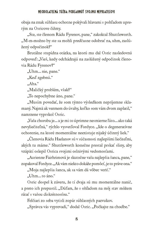 Originálna a neuveriteľne zábavná prvá časť romantickej duológie o nepriateľoch, z ktorých sa stanú milenci, zasadená do jedinečného fantasy sveta. Osric Mordaunt, člen rádu Fyrenov a nájomný vrah naliehavo potrebuje liečenie. Iróniou osudu jedinou osobou, ktorá mu môže pomôcť, je Aurienne Fairhrimová, rešpektovaná vedkyňa, stelesnenie morálky a – členka nepriateľského rádu. Aurienne zúfalo potrebuje peniaze na financovanie výskumu kiahní, ktoré zasiahli ich krajinu a trpia nimi stovky nevinných detí. Keď ju Osric podplatí, súhlasí, že mu pomôže, napriek tomu, že nenávidí všetko, čo predstavuje. Vynútená spolupráca geniálnej vedkyne a profesionálneho zabijaka privedie Aurienne k starým mystickým praktikám, ktoré nemajú s vedou nič spoločné. Osric a Aurienne spolu vyšetrujú opätovný výskyt tajomnej smrtiacej nákazy. Horlivo pri tom popierajú nákazu vzájomnej príťažlivosti, čo len zosilňuje iskrivé napätie, ktoré medzi nimi vládne od prvej chvíle.