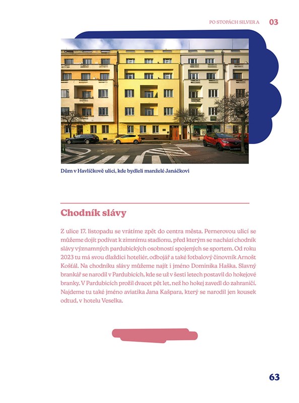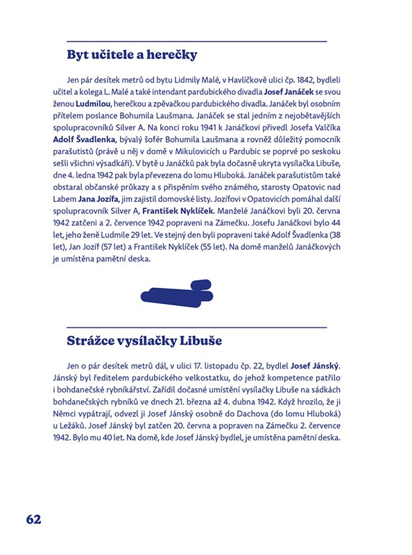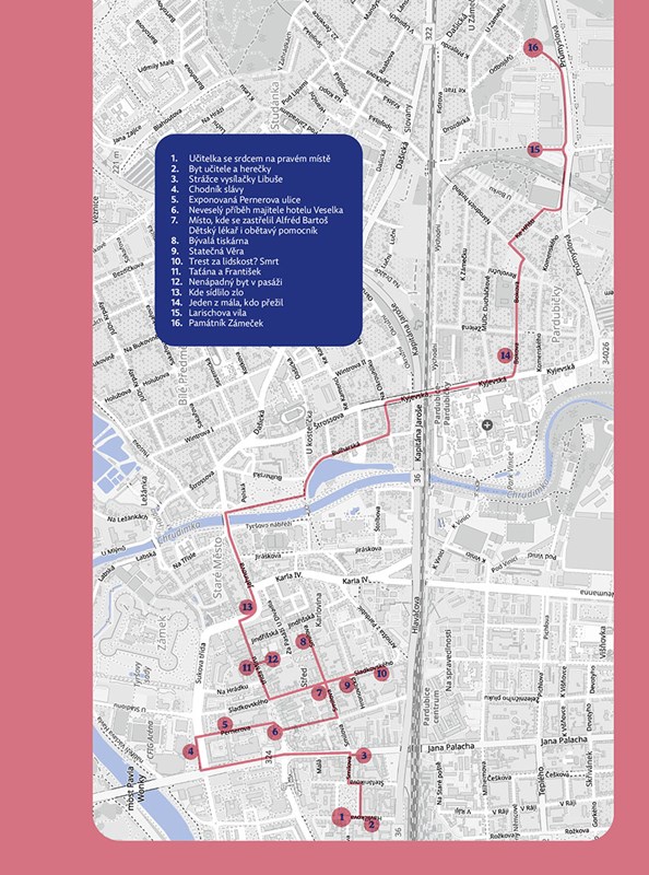 S knihou – společníkem a malým průvodcem dějinami i současností města. Můžete spolu prožít a vychutnat si celkem osm tematických procházek, od nejstarších dob a odkazu Pernštejnů přes působení výsadku Silver A, architekturu Boži Dvořáka až po současné kulturní Pardubice. Ulice, parky, budovy úřadů, kostelů, škol, hotelů, obchodů i bytové domy vám před očima budou vyprávět své unikátní příběhy, vzpomínat na své návštěvníky, stavitele a obyvatele, na dramata i všední život, jenž se v nich odehrál.