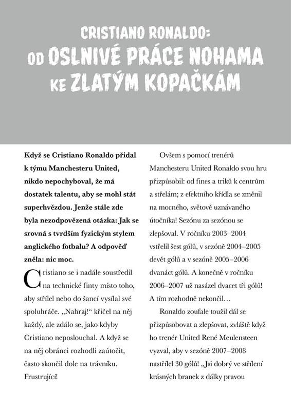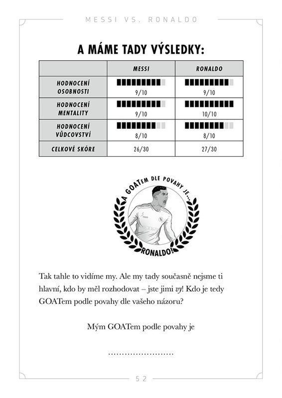Dva fotbaloví velikáni a jedna zásadní otázka. Kdo z nich je skutečný GOAT, tedy nejlepší fotbalista všech dob? Věčné téma všech fanouškovských diskusí o fotbalu. Tato zábavná a napínavá kniha tě provede úžasnými kariérami Lionela Messiho a Cristiana Ronalda – od úplných začátků až po rekordy, které přepsaly dějiny. Dozvíš se spoustu zajímavostí, porovnáš jejich statistiky, získané trofeje, herní styl i největší momenty na trávníku. A nakonec možná najdeš odpověď na otázku, kterou si kladou fanoušci po celém světě.