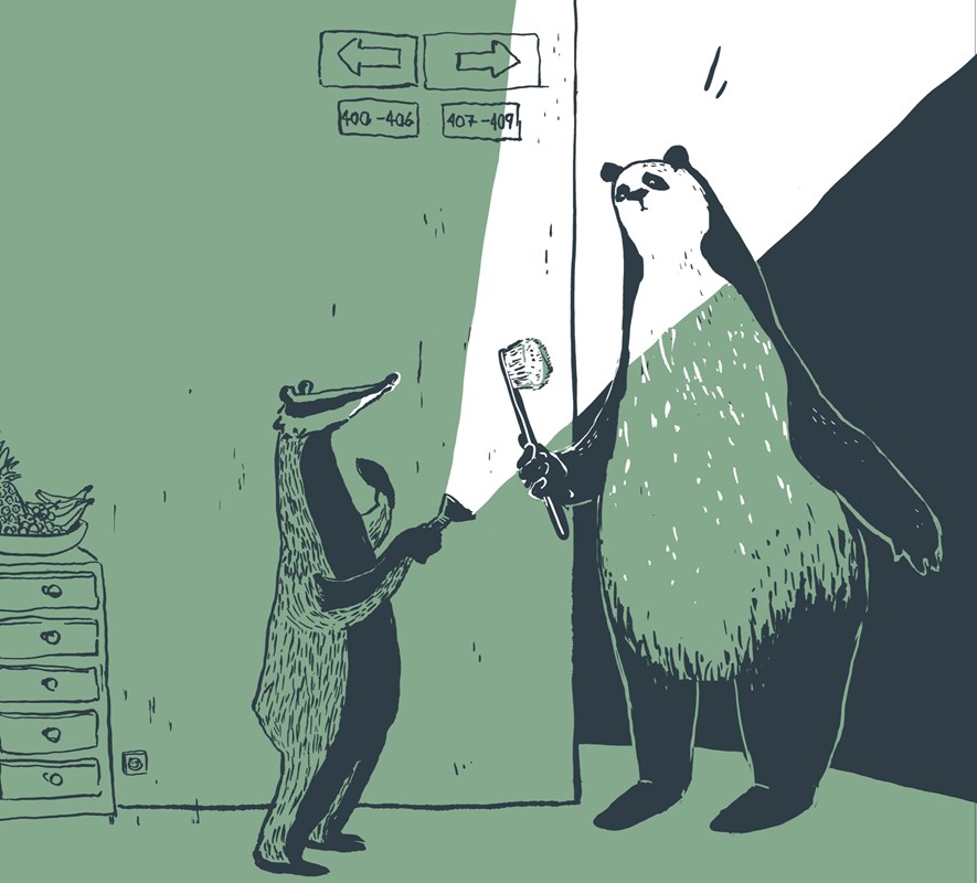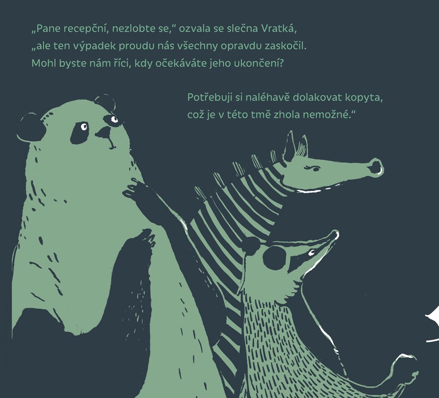 Jezevec pan Skřípal je inspektor tunelů a jen tak něčeho se nelekne. Právě usedá k večeři, když vtom – zhasne světlo! Jaká drzost! Je to výpadek elektřiny? Možná. Pan Skřípal bere svou nejsilnější baterku a vydává se k recepci zjistit co a jak. V hotelu je tma jako v jezevčí noře. A ve tmě všechno vypadá mnohem, MNOHEM strašidelněji. Světlo baterky kreslí po chodbách neuvěřitelné věci. A co teprve na recepci! Tam řádí nejpříšernější, nejukrutánštější příšera… ze které se ve vteřině vyklube… no jen se nechte překvapit!