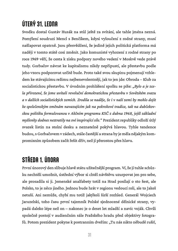 Rok 1989 v časech skomírající vlády komunistů jedinečně zpracovaný den po dni. Poslední novoroční projev prezidenta Husáka, Palachův týden, Děčínská kotva, Gottovy padesátiny, bezradný disent, odvážná Hanka Zagorová, Nohavica u Karla Kryla, Praha plná trabantů, protisovětská bouře na stadionu Baníku Ostrava, lavírující i netečná veřejnost. Příběhy roku mapuje autor, právní historik, na základě archivů a osobních prožitků. Doba veksláků, korupce a kolísajících nadějí.