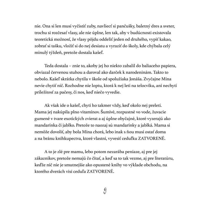 Mína nijako extra nemiluje knihy, papier ani ľudí. Zo všetkého najradšej má balet a melónové žuvačky. A, samozrejme, svoju maminu, ktorá ako na potvoru jedno malinké kníhkupectvo naozaj vlastní. Iba pre ňu sa Mína snaží v obchode pretrpieť každé popoludnie a trochu jej pomôcť so všetkými tými zvláštnymi knižkami, ktoré predáva, a s ešte podivnejšími náhodnými okoloidúcimi, ktorí sa do kníhkupectva skôr zatúlajú, než by doň skutočne zamierili.