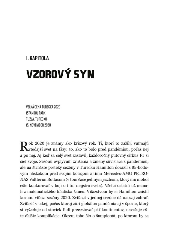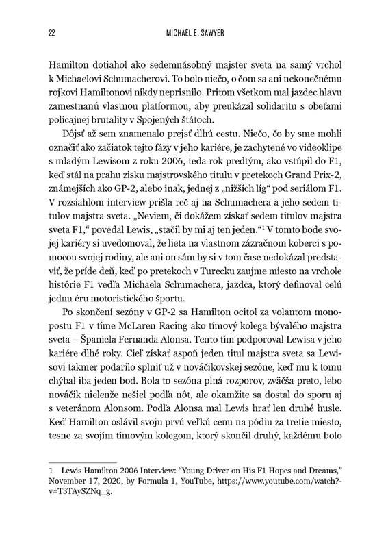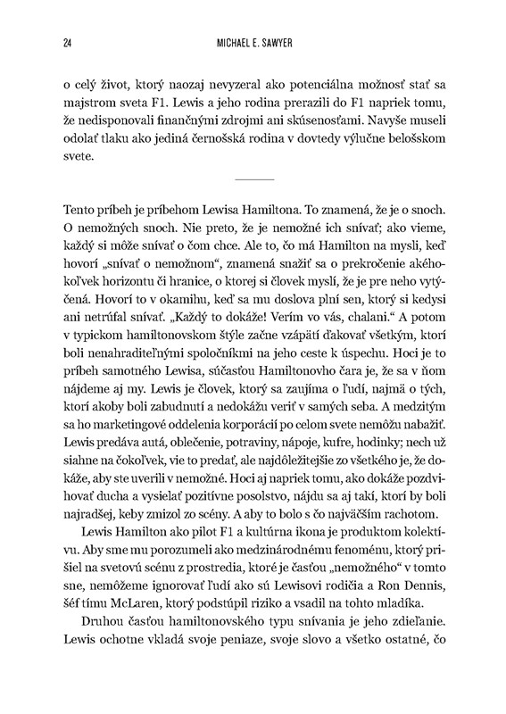 „Dnes je rýchlosťou svetla odvysielaná každá minúta každého dňa. Celý svet môže rozoberať akékoľvek prerieknutie, nech by bolo mienené v dobrom či v zlom. Zlé správy sa šíria rýchlosťou blesku a majú tendenciu zatieniť akékoľvek komplexné posúdenie dotyčného človeka, situácie, kontextu či prehodnotenia. Lewis Hamilton to všetko prijíma,“ píše Sawyer v úvode.