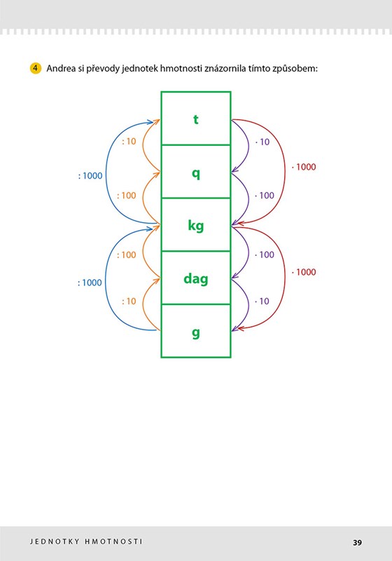 Kniha ukazuje možnosti, jak si znázornit a tím i snadněji zapamatovat a převádět jednotky délky, hmotnosti, obsahu, objemu a času. Dítě si pak může vybrat tu, která mu nejvíc vyhovuje nebo si vymyslí vlastní pomůcku.