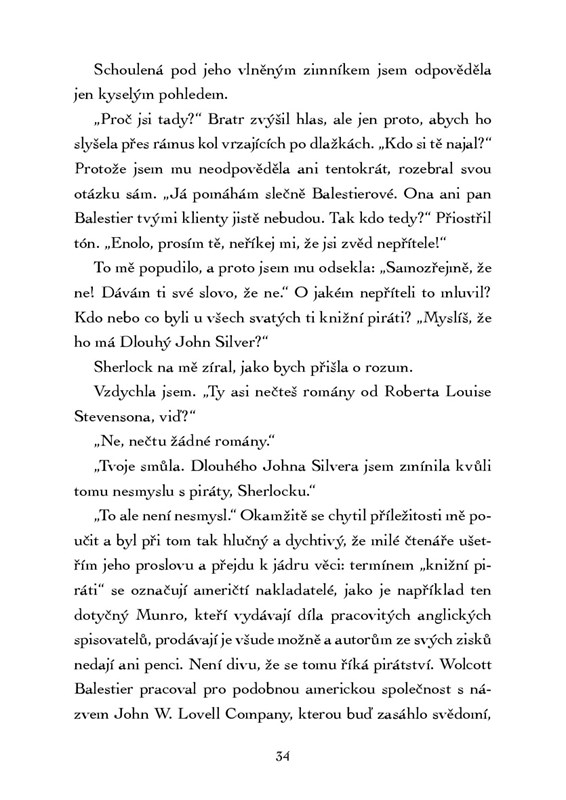V květnu 1890 je Enola už zcela samostatná, před nikým se neskrývá a naplno se věnuje své práci vědecké investigátorky. Když zmizí americký literární agent Wolcott Balestier, Enolu osloví jeho přítel Rudyard Kipling – po zjištění, že vyšetřovatelkou má být mladá žena, se ale raději obrátí na Sherlocka. Enola se však nehodlá nechat vyšachovat a pouští se do pátrání na vlastní pěst. Co se stalo s Balestierem? Jsou do všeho zapletení také američtí nakladatelé? A jak nemilosrdný může být svět knižního byznysu?
