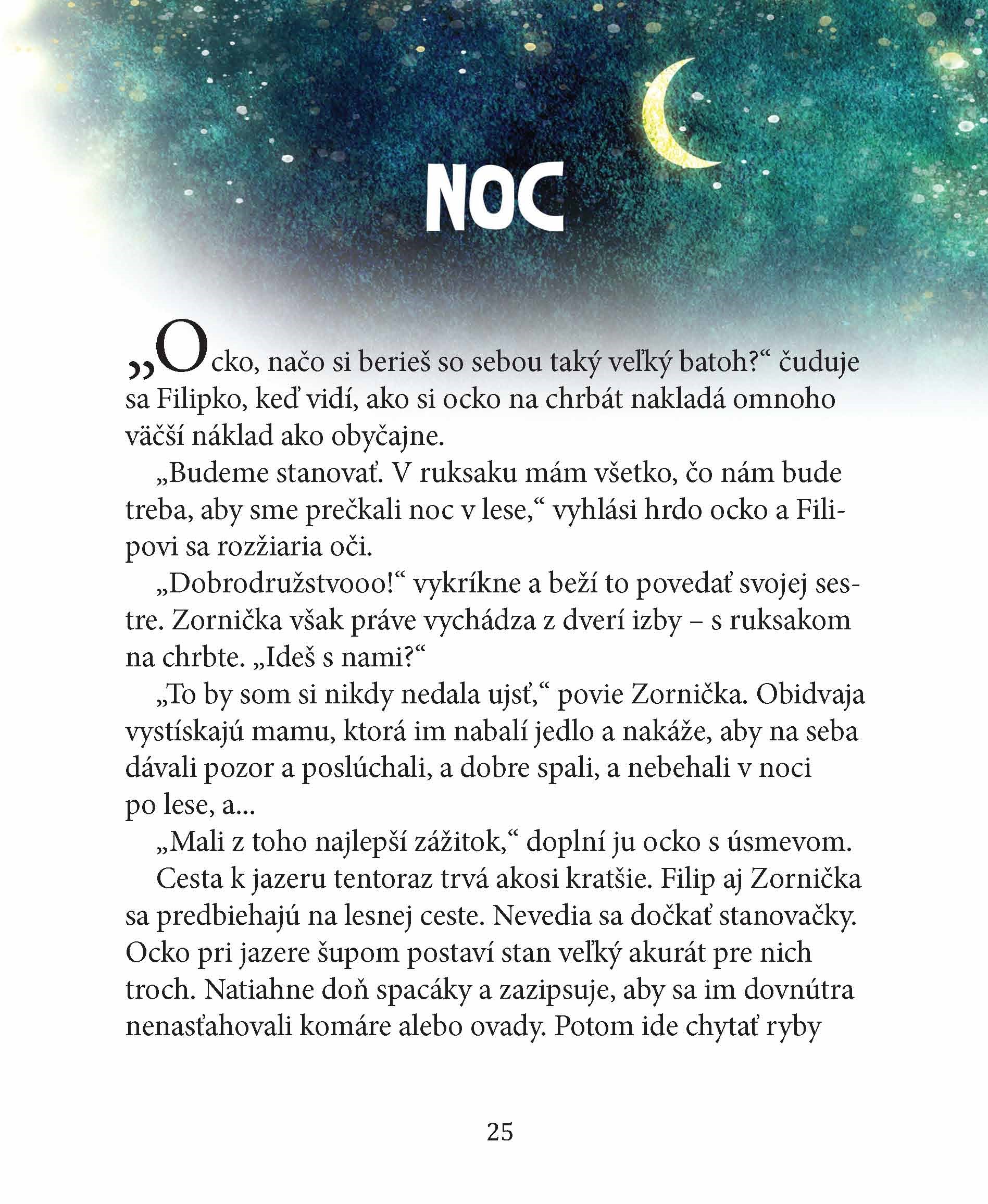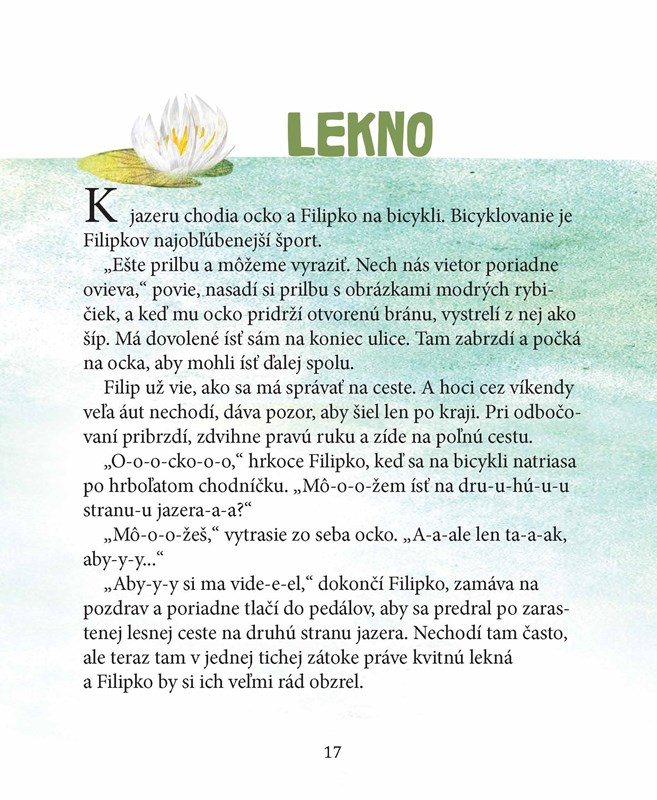 Lesík okolo jazera je po daždi krásny a voňavý. Filipko tam často chodí s ockom na ryby. Vysedávanie pri vode ho nebaví, radšej sa hrá s kamarátmi škriatkami, obdivuje srnky, malé diviačiky, dafnie aj korčuliarky. Čoskoro však pôjde prvýkrát do školy a najradšej by si vzal so sebou celý les, aby mu nebolo smutno. Je tam toľko zázračných vecí! Ocko má však lepší nápad...