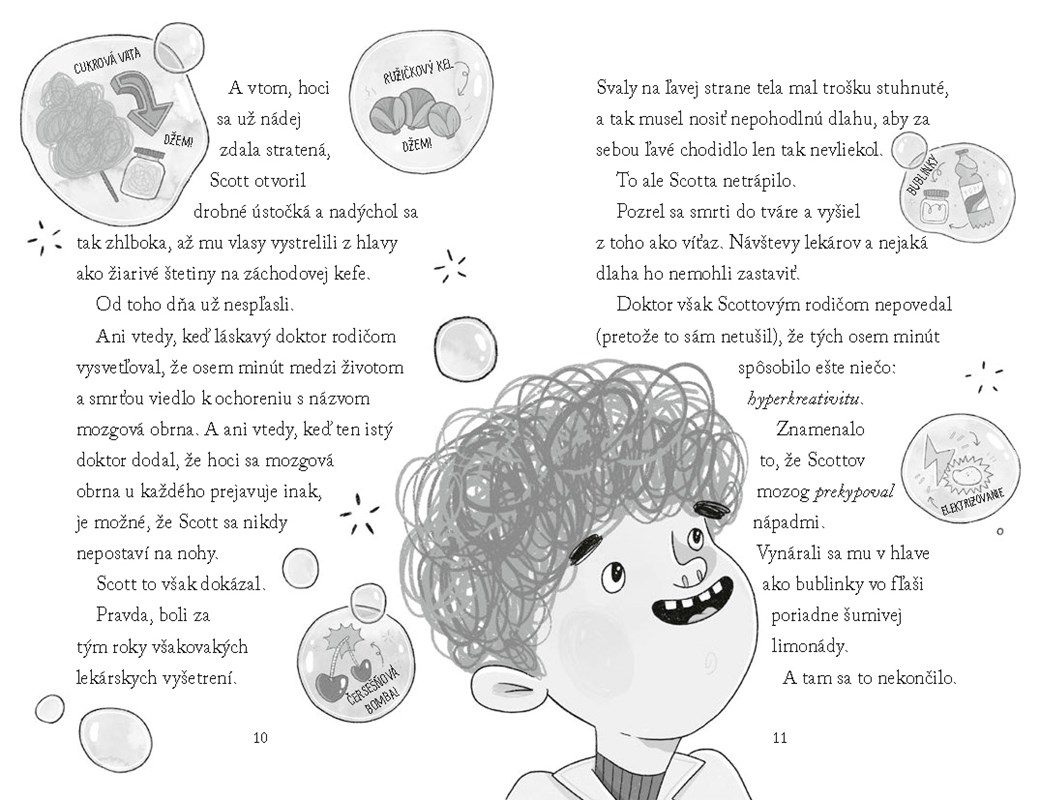 Príbeh nie je zložitý. Je tu zloduch (pani Dafné) a sú tu hrdinovia (Scott a Fizzy). Mne sa na príbehu páčila odlišnosť Scotta od ostatných detí. Nosí na nohe ortézu a prekypuje nápadmi. Miestami sa cíti osamelo a chce pri sebe niekoho, kto si vypočuje jeho nápady a bude s ním kamarát. Určite sa nájde veľa detí, ktoré sa cítia byť iné pre rôzne príčiny a príbeh im môže dodať trochu sebavedomia. Oceňujem, že susedka Dafné si svoje prešľapy neskôr uvedomila a rodine pomohla. Deti tak pochopia, že aj zlý človek sa môže zmeniť, ak sám chce.