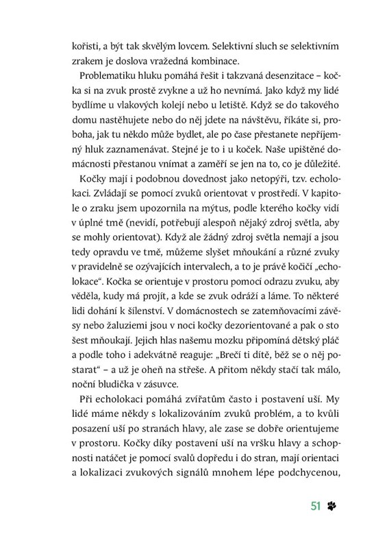 Najdete v ní mnoho rad, jak vyladit k dokonalosti vzájemné soužití. Autorka mimo jiné vysvětluje, co jsou konejšivé signály, čím se liší kočičí smysly v porovnání s lidskými, jaké jídlo kočkám prospívá a naopak škodí nebo na co si dát pozor při udržování čisté společné domácnosti. Poslední kapitoly jsou věnované aromaterapii a také trochu věcem mezi nebem a zemí. Je kočka skutečně magická bytost, která dokáže uzdravovat? Kniha je doplněna mnoha barevnými fotografiemi ze života těchto malých svérázných šelem.