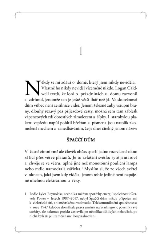 Eden v Kentucky je zapadlé městečko, které proslavila jen legenda o E. Starling. Než napsala knihu Podsvětí a zmizela, postavila tady Špaččí dům. Dnes se všichni shodnou, že nejlepší by bylo nechat ho shnít i s dědicem Arthurem Starlingem. Opal ví, že není radno zaplétat se se strašidelnými domy a zádumčivými muži, jenže pak přijde nečekaná pracovní nabídka. A Špaččí dům jí začne připadat jako domov, který nikdy neměla. Ale smrtící zlo se blíží. Jestli chce mít Opal útočiště, bude o něj muset bojovat.