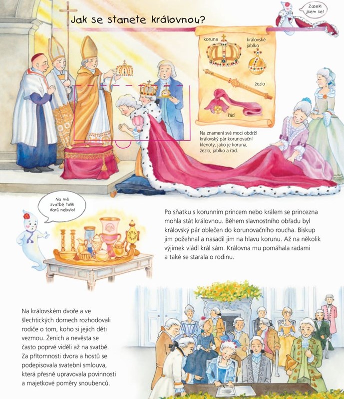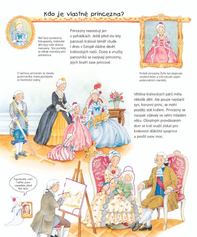 Co dělaly princezny přes den, co se učily ve škole a jaké nosily šaty a šperky na ples? A proč měly past na blechy? Tato knížka vezme děti na fascinující výpravu do světa plného lesku a elegance, doplněnou o zajímavosti ze života u dvora. Součástí je i odnímatelná princezna a nádherné šaty.