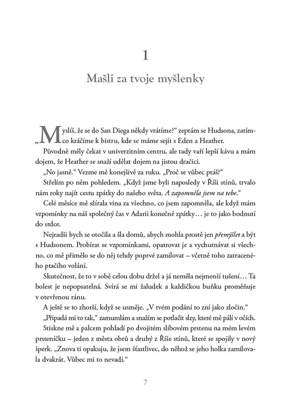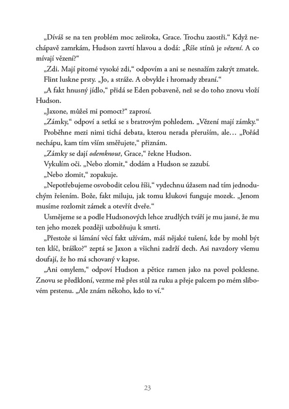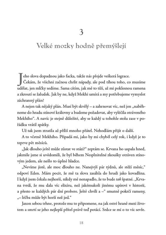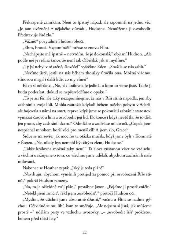 Od chvíle, kdy jsme porazili Cyruse, uběhly tři klidné měsíce. Teď se zase všechno hroutí. Kruh se rozpadá, ve stínech roste nová hrozba a já nemám na výběr. Musím se vrátit do Říše stínů, postavit se děsivé královně a uzavřít s ní dohodu. Je to jediná cesta, jak zachránit Mekhiho. Naštěstí půjdou moji přátelé i Hudson. Jenže s ním není něco v pořádku.