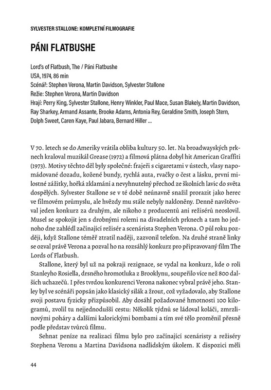 Sylvester Stallone není jen akčním hrdinou, hvězdným hercem a hollywoodskou celebritou. Je něco víc, je skutečným ztělesněním amerického snu o tom, jak se obyčejný chlápek, opravdový outsider, dostane díky svému odhodlání a nezlomné vůli až na vrchol. Tato kniha vás provede jeho životem, jak tím soukromým, tak především filmovým. Od prvních malých roliček, přes legendární postavy Rockyho a Ramba až po poslední herecké počiny. Těšit se můžete nejen na podrobný rozbor Stallonovy filmografie a poutavý pohled za hollywoodské kulisy, ale rovněž na spoustu zajímavostí z osobního života a perliček z natáčení.