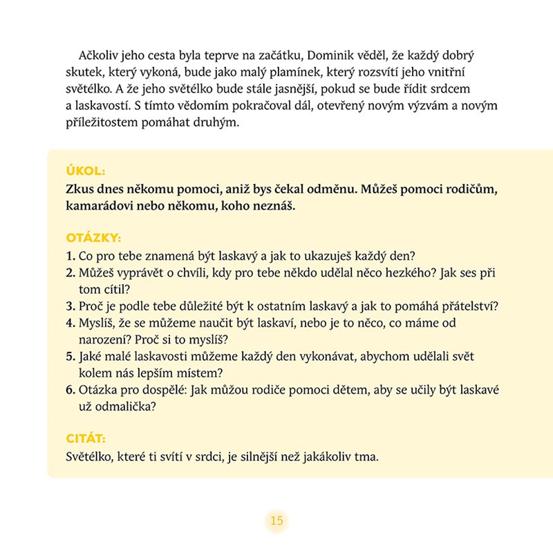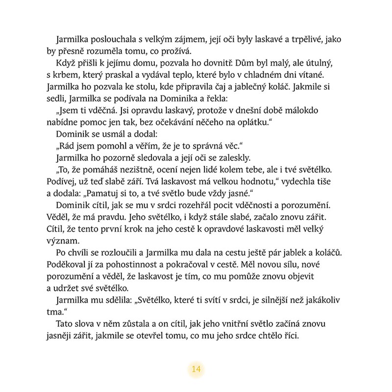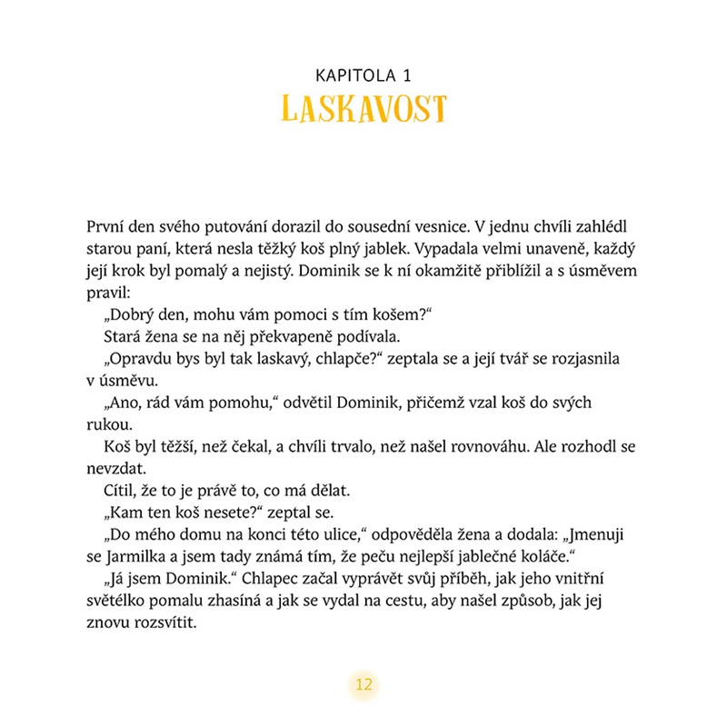 Na každém kroku objevuje, jak vnitřní hodnoty mohou proměnit jeho vlastní svět, ale i životy ostatních. Moudří a laskaví průvodci pomohou světlo malého Dominika opět rozzářit – a prozáří i srdce malých i velkých čtenářů.
