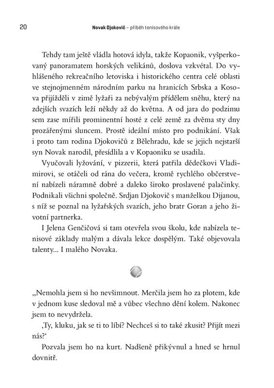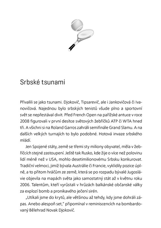 Sportovní novinář Zdeněk Pavlis sleduje životní cestu Novaka Djokoviče z Bělehradu až na tenisový trůn, všímá si toho, co musel obětovat, smeká před jeho talentem a energií, kterou do tenisu dává. Na této čtivé biografii se podílel také osobní trenér Marián Vajda a vznikala s vědomím samotného Novaka Djokoviče.