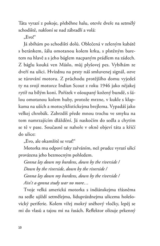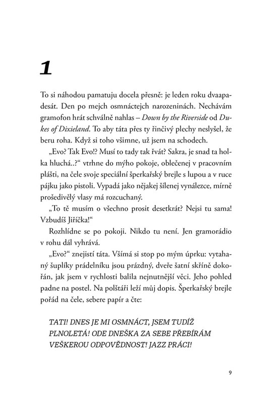 Eva Olmerová – divoká duše českého jazzu. Její cesta začala v rodině prvorepublikového diplomata, vinula se mezi pražskou uměleckou elitou a vedla až k?velkým úspěchům i krátké éře v divadle Semafor. V?této novele ožívají její bouřlivé vztahy, bolestné rozchody i střety se státní mocí, kvůli kterým skončila až ve vězení. Petr Jarchovský vypráví silný příběh ženy, která žila naplno a bez kompromisů.