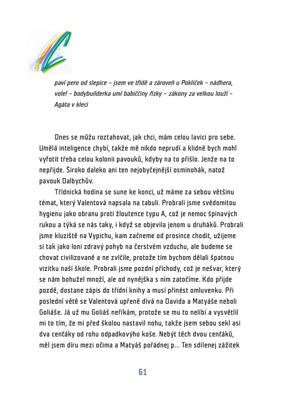 Když má člověk ve jménu radost, jsou všechny problémy i výzvy osudu zajímavé a vzrušující. A jedenáctiletý Džojo ji opravdu má – jeho jméno v esperantu právě znamená radost. Svět se podle něj hemží zajímavými lidmi, z oblud se stávají kámošky, kočky mají magické oči, ve třídě bydlí dvanáctinohý pavouk a hrdinům řeckých bájí se dá přepsat životopis! To pak není čas na rozumné úvahy. Musí se běhat sprintem po schodech, malovat oběma rukama naráz, dostat první pusu, a vůbec žít ten báječně bláznivý život!