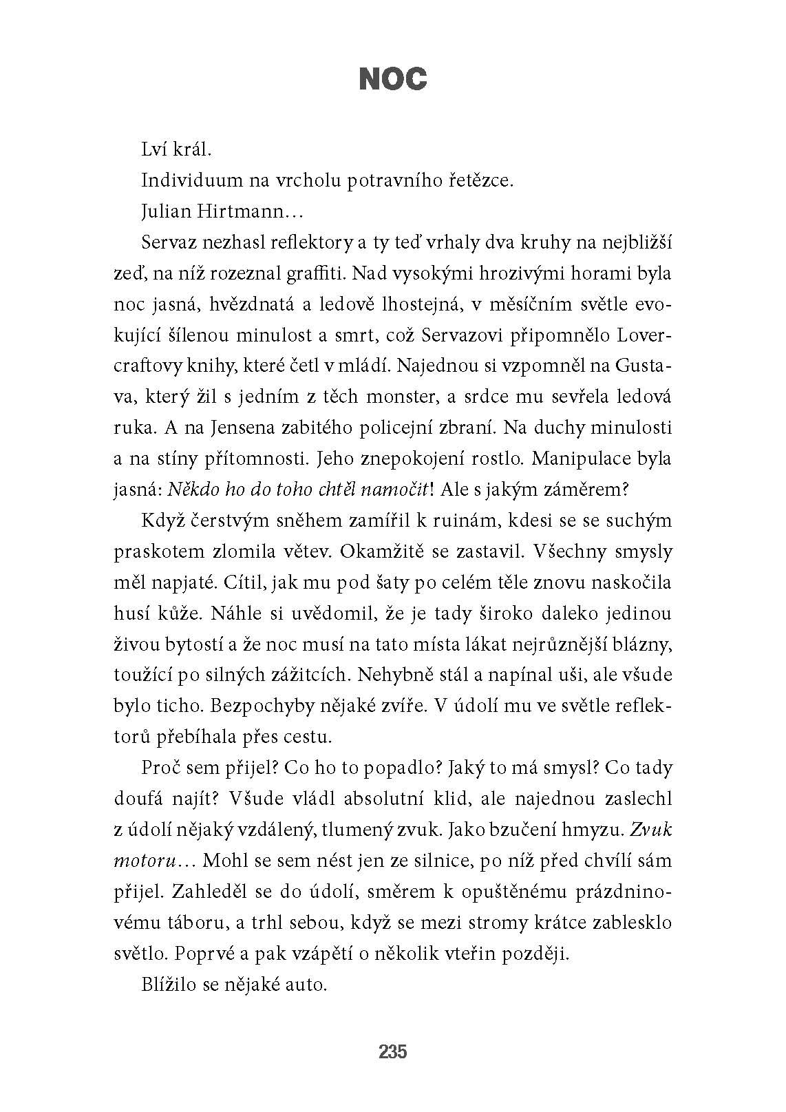 Během vyšetřování vraždy na ropné plošině v Severním moři narazí norská inspektorka Kirsten Nigaardová na sérii fotografií. O pár dní později už sedí v toulouské kanceláři kriminalisty Martina Servaze, který si snímky se zájmem prohlíží. Je na nich on sám zachycený teleobjektivem nepolapitelného sériového vraha Juliana Hirtmanna. To ale není vše. Na dalším snímku je malé dítě, Gustav. Pro Kirsten a Martina začíná děsivá výprava s ještě děsivějším nepřítelem na jejím konci.