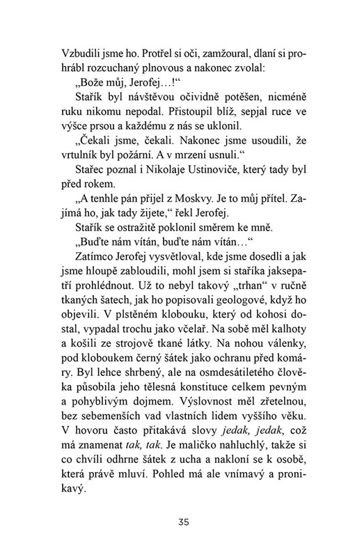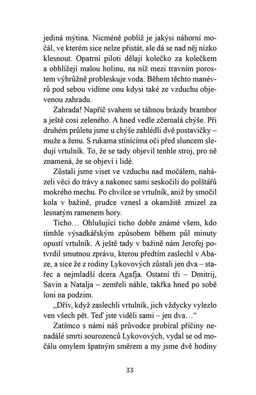 Koncem 70. let 20. století spatřil ruský pilot při přeletu nad odlehlým úsekem sibiřské tajgy obdělávané pole stovky kilometrů od jakéhokoli osídlení. Tým geologů zanedlouho našel primitivní dřevěný srub a rodinu oblečenou v hadrech, která mluvila, myslela a žila způsobem ruských rolníků za vlády cara Petra Velikého. Rodina Karpa Osipa Lykova patřila k ruským pravoslavným „starověrcům“, kteří se nejdříve izolovali od světa za náboženského pronásledování v době Petra Velikého a poté uprchli z domovů kvůli Stalinově kolektivizaci. Ve 30. letech se Lykovova rodina vydala na dva tisíce kilometrů dlouhou cestu z Ukrajiny do hlubin sibiřské tajgy a v době, kdy je autor knihy Vasilij Peskov poznal, přežívali už více než padesát let sami jen díky tomu, co dokázali sklidit, ulovit a postavit vlastními silami. Jak se sem dostali, jak přežili a jak nakonec zvítězili v drsných podmínkách v tajze tvoří jedno z nejpozoruhodnějších lidských dobrodružství