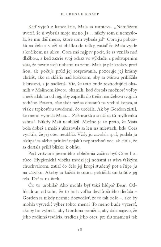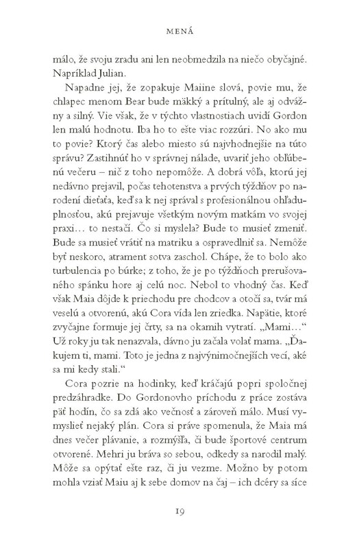 Dojemný román o domácom násilí a oslobodení, zložitých rodinných vzťahoch a uzdravení. Píše sa rok 1987. Cora sa vydáva s deväťročnou dcérou Maiou zaregistrovať narodenie svojho syna. Jej manžel Gordon, miestny lekár, v komunite rešpektovaný muž, doma desivý a despotický tyran, chce, aby dieťa pomenovala po ňom. Cora by chcela meno Julian, malej Maii sa páči Bear. Keď sa matrikárka spýta, ako by chcela dieťa pomenovať, Cora zaváha… Nasleduje tridsaťpäť rokov troch alternatívnych a striedajúcich sa verzií života Cory, jej syna aj celej rodiny, ktoré ovplyvnila jediná voľba mena. S výnimočnou citlivosťou a hĺbkou nás autorka vťahuje do príbehu jednej rodiny, rozprávaného cez prizmu „čo keby“. Brilantná imaginatívna štruktúra knihy, strhujúce rozprávanie a srdcervúca emotívna sila určite urobia z románu Mená modernú klasiku.