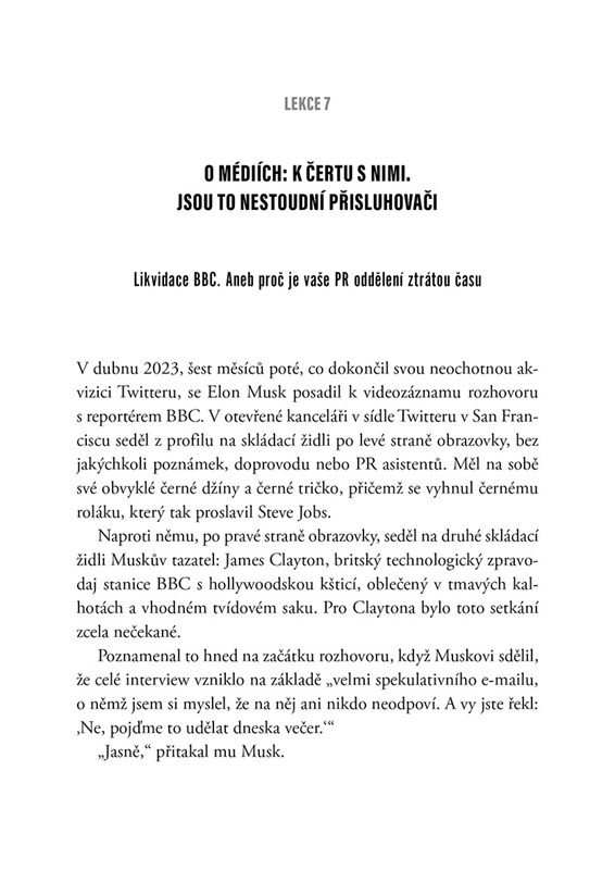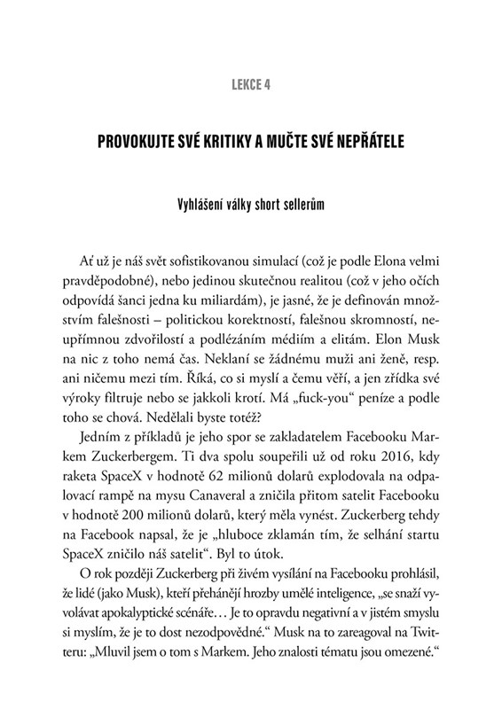 Elon Musk – jedna z nejvlivnějších i nejkontroverznějších osobností naší doby – je nejen nejbohatším mužem světa, ale také skutečným vizionářem. Zkušený novinář a redaktor magazínu Forbes Dennis Kneale v této jedinečné knize mapuje nejen Muskovu výjimečnou cestu, ale představuje ho rovněž jako zdroj inspirace, proniká do samotné podstaty Elonovy filozofie a rozebírá principy, které jej provázely po celou dobu podnikatelské kariéry. Díky těmto principům, rozděleným do 11 lekcí, můžete načerpat cenné informace pro váš byznys i život, naučit se sázet sami na sebe a měnit krize v příležitosti navzdory všem překážkám.
