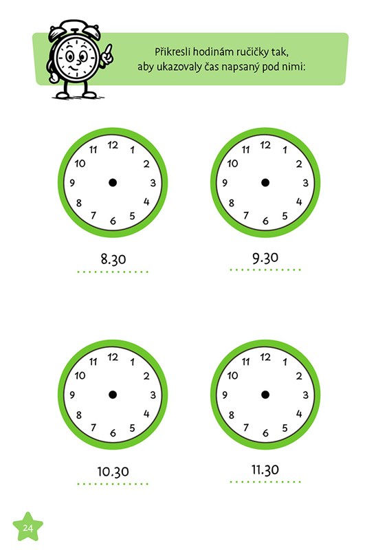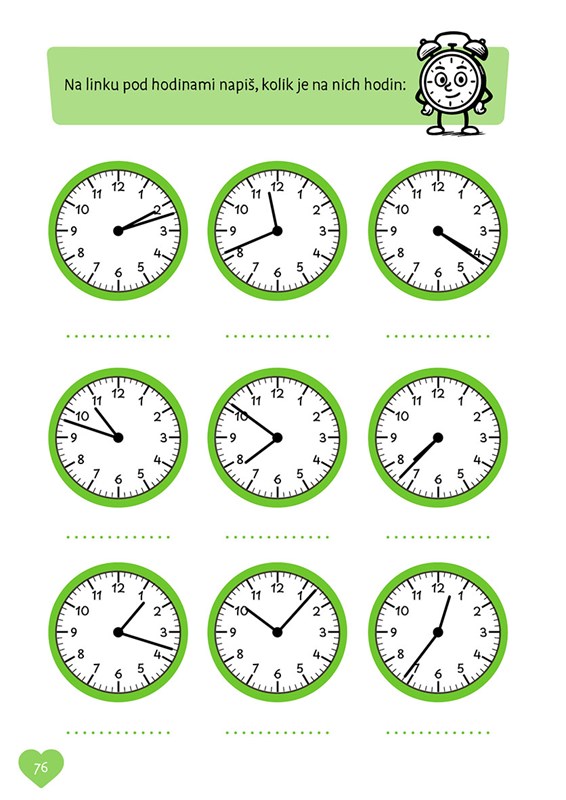 V pěti úrovních – celé hodiny, půlhodiny, čtvrthodiny, pětiminuty a minuty – si děti hravě procvičí polohu hodinových ručiček, zápis času i hledání chyb.