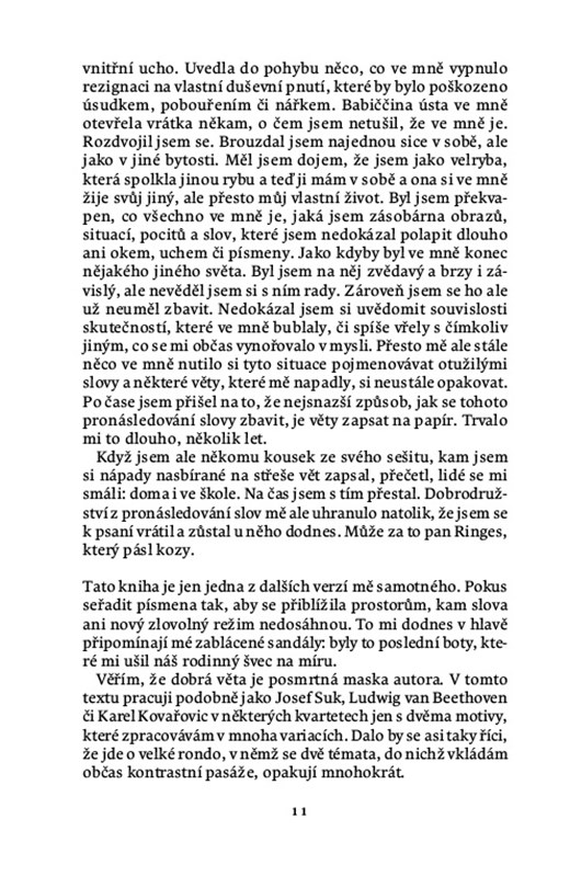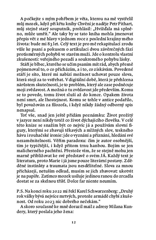 V nejnovější knize esejisty a novináře Karla Hvížďaly (1941) se setkáváme nejen s jeho celoživotními tématy, jako jsou možnosti a meze prózy a interview jako žánru, role intelektuála v digitální době nebo reflexe proměny světa. Tentokrát jde také o návraty do dětství, ohledávání dávných osobních selhání i o snahu vyrovnat se s nezvratností odcházení včetně překvapivého citového vzplanutí. Jde o knihu nejosobnější a nejotevřenější. Hvížďala o ní hovoří jako o karnevalu imaginace nad záhadou psaní a lásky v době dvou blízkých válek.