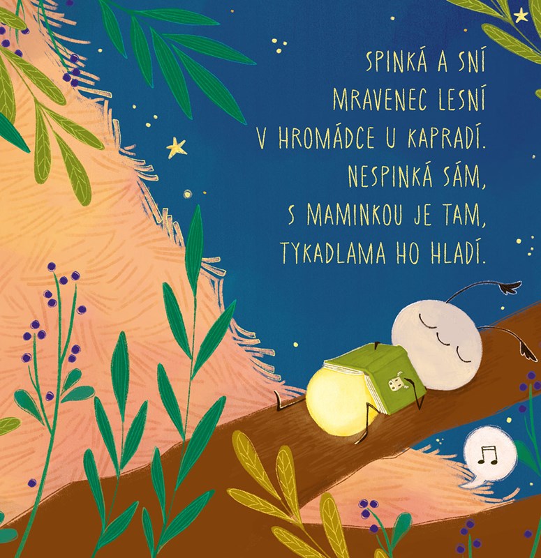 Oblíbená a laskavá písnička pro malé děti, mravenečky a broučky v knížce plné milých obrázků. Pohlazení do postýlky, hezká chvilka před spaním. Po stisknutí tlačítka si děti mohou poslechnout písničku a zazpívat jemnou mravenčí ukolébavku.