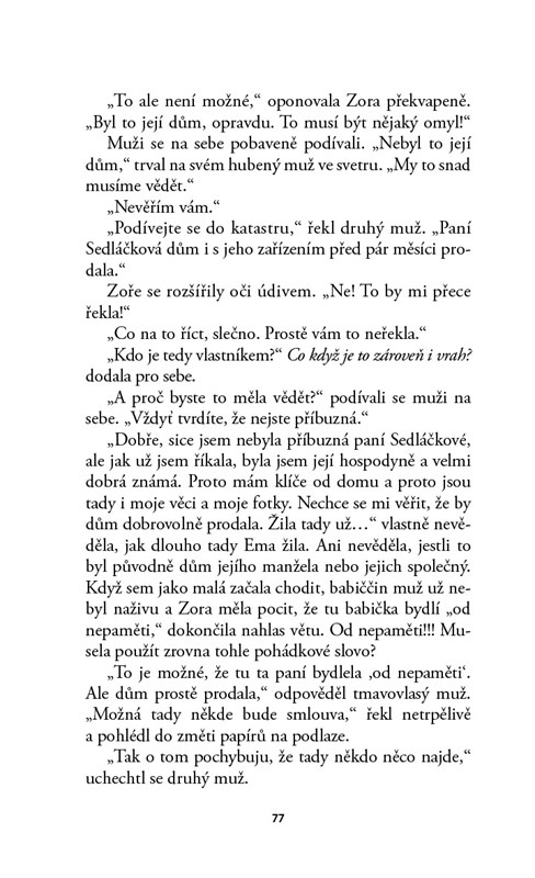 Zora je rozvedená matka hyperaktivního chlapce, se kterým to nemá snadné. Pomáhá jí mimo jiné i „babička“ Sedláčková, která ji hlídala, když byla malá, a zůstaly si blízké až do Zořiny dospělosti. Místo obvyklé návštěvy přijde jednou šok – Zora najde Emu Sedláčkovou mrtvou na poli za jejím domem. Policie jako příčinu úmrtí označí infarkt, jenže tady něco nesedí. Zora začíná pátrat v minulosti ženy, které bezmezně věřila, a odhaluje znepokojivé skutečnosti… a už nejde jen o pravdu. Jde o život.