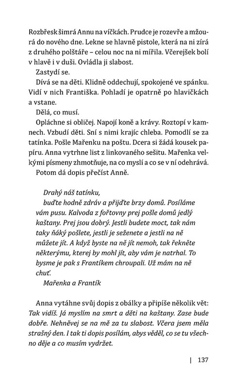 Nový román Jany Poncarové napsaný na základě korespondence z první světové války, která se dochovala na půdě autorčiny chalupy v Dobřívě u Rokycan, je autentickým svědectvím o životě jedné rodiny. Více než sto let staré dopisy odhalují skutečný příběh a jejich pisatelé ožívají. František Reindl, majitel rozlehlého hospodářství, odchází do války, jejíž smysl je mu cizí. Břemeno správy statku spočine na ramenou jeho ženy Anny, která musí čelit nejen osamění, ale i zlobě lidí. Kvůli svým dvěma malým dětem snáší nekonečnou dřinu i četná příkoří. Oporou jí jsou Františkovy dopisy a naděje, že jednoho dne boje skončí.