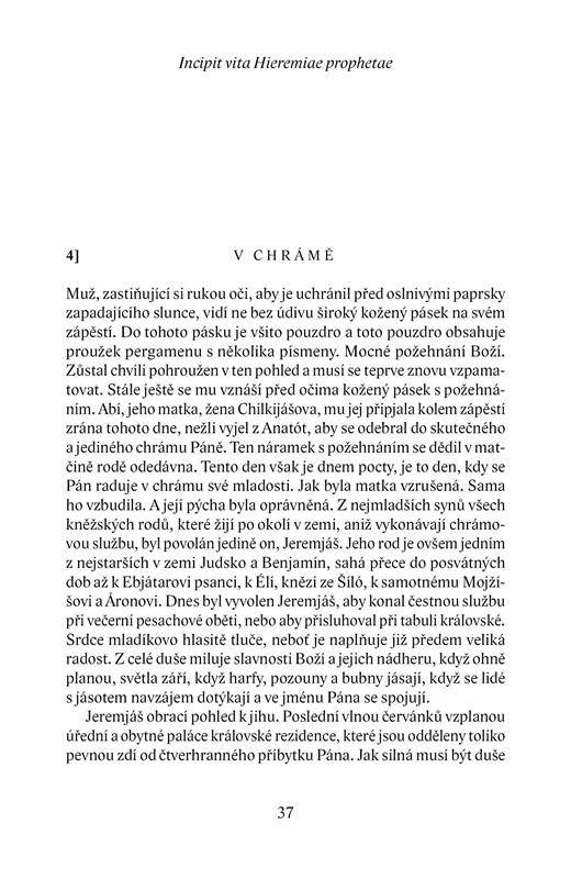 Životní příběh starozákonního proroka Jeremiáše byl a stále zůstává naléhavým varováním před všemi podobami osobního a společenského násilí. Tak jej chápal i slavný pražský rodák Franz Werfel ve svém románu o těžké úloze této velké biblické postavy. Román vznikal pod vlivem tíživých událostí v Německu roku 1936, a to umocňovalo působnost dávného Jeremjášova poslání. Přestože již v roce 1933 byly v Německu spáleny všechny Werfelovy spisy, neváhal se svým novým dílem postavit sílící totalitní nacistické praxi a vůbec všem, pro něž byla vždy prvořadou jejich vlastní moc. Ve Werfelově pohledu se tak postava babylonského krále Nabukadnezara stává snadno srovnatelnou s osobou Adolfa Hitlera, utrpení proroka Jeremiáše s utrpením Židů a zničení Jeruzaléma a jeho Chrámu roku 586 př. Kr. apokalyptickým obrazem budoucnosti Evropy ohrožené nacismem. I dnes si vynikající Werfelovo dílo zachovává svou aktuálnost. Vždyť totalitní myšlení nijak nevymizelo ze světového dění, jen jeho metody mění svou tvář.