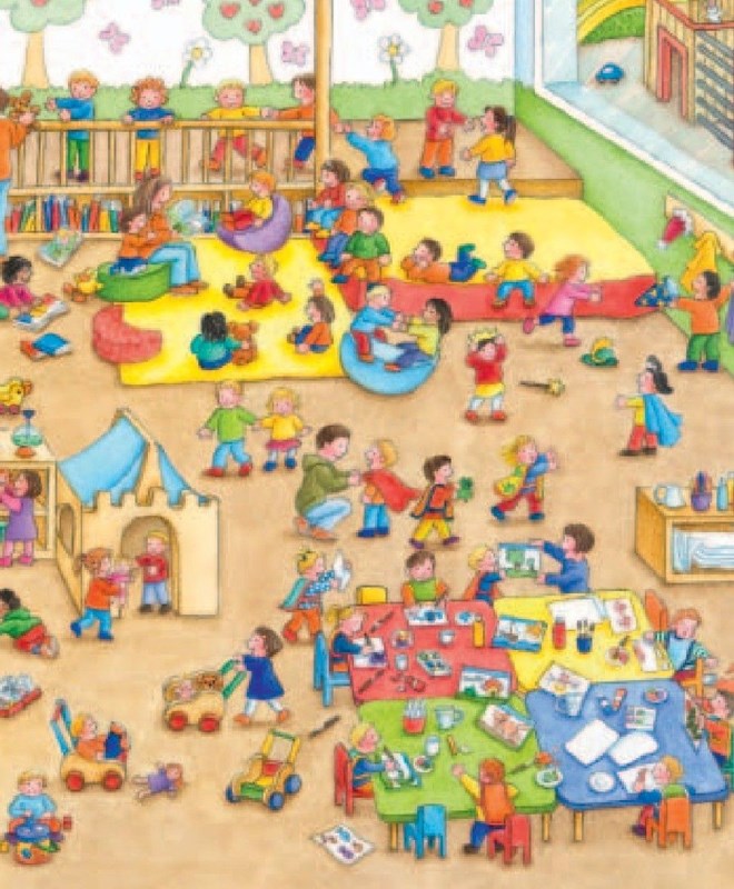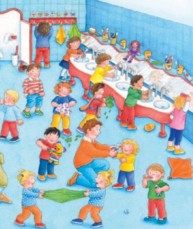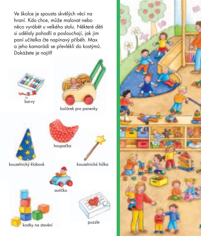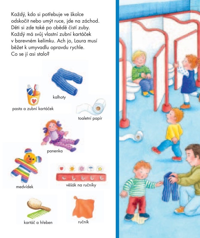 Jak vypadá koupelna, kam se chodí ven a jaké hračky mají ve školce? Tato knížka pomůže dětem snadno a zábavně rozvíjet slovní zásobu a připravit se na první krůčky do jeslí nebo školky. Vzhůru do školkového světa plného dobrodružství!