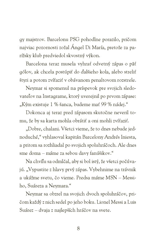 Od skromných začiatkov v Brazílii až po získanie pozície v najobávanejšom útočnom triu svetového futbalu prešiel Neymar da Silva Santos Júnior dlhú a náročnú cestu. K získaniu niektorých významných futbalových trofejí musel prekonať vážne zranenie a vyrovnať sa s obrovským tlakom a očakávaniami celého národa. Inšpirujte sa príbehom jedného z najtalentovanejších futbalistov planéty.