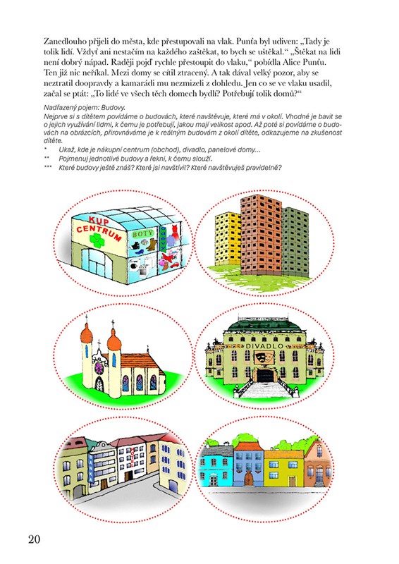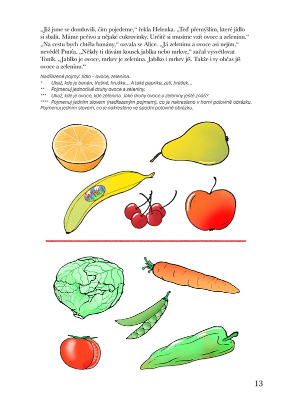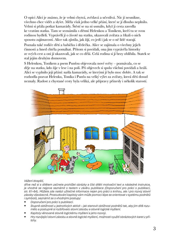 * Především systém podnětů pro rozvoj řeči a slovně logického myšlení formou povídání, her a dalších aktivit. Řazení činností kopíruje a respektuje vývojové fáze slovní zásoby a porozumění řeči od pasivní úrovně po aktivní slovník. Náročnost úkolů se stupňuje od těch pro dítě méně obtížných po obtížnější, představující vývojově vyšší roviny. Náměty jsou nabízeny tak, jak se dítě s pojmy a situacemi může setkávat. Je vytvářen prostor k propojování jednotlivých informací, přemýšlení ve vzájemných vazbách a souvislostech.