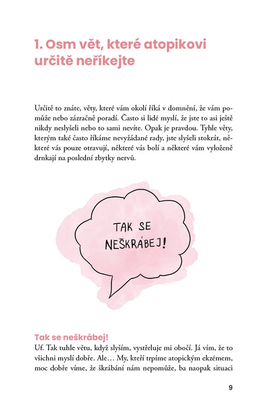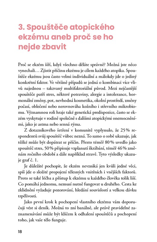 Tato kniha je autentickým a hluboce osobním svědectvím o životě s atopickým ekzémem – nemocí, která zasahuje mnohem víc než jen kůži. Autorka otevřeně sdílí svou cestu od dětství s mírným ekzémem přes bolestivé období plné fyzického i psychického vyčerpání až po zásadní rozhodnutí opustit klasickou léčbu a začít naslouchat vlastnímu tělu. Popisuje své zkušenosti s vysazením kortikoidů, těžkým abstinenčním syndromem (TSW), ale také s hledáním alternativních cest – od změny životního stylu přes terapii až po komunitní podporu.