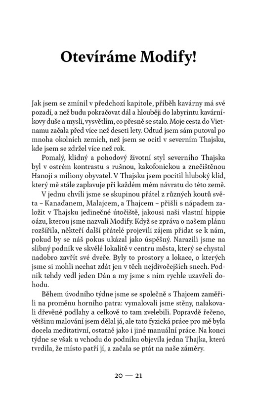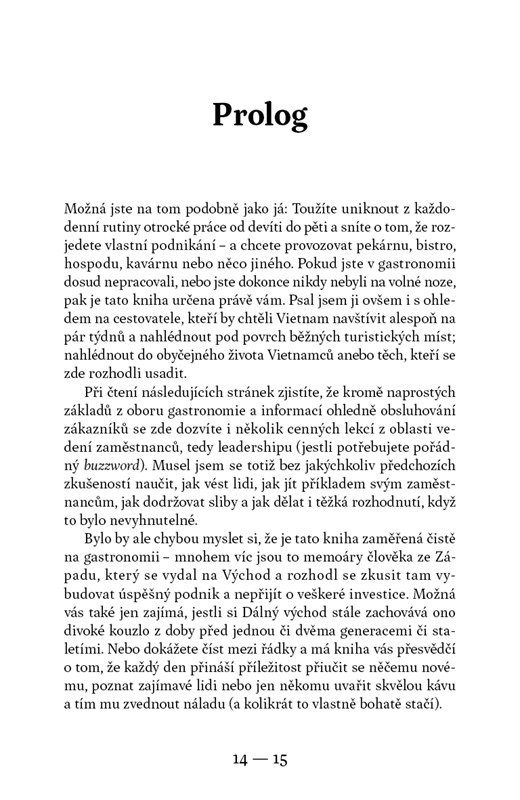 Skutečný příběh snílka, který si sbalil život do jednoho batohu a o 11 000 kilometrů dál a pár let později si otevřel kavárnu ve Vietnamu. Jedinečný vhled do každodenních radostí i frustrací, které s sebou přináší podnikání v odlišné kultuře, okořeněný humorem a velkou dávkou upřímnosti a doplněný o získané zkušenosti a poučení, které ocení nejen začínající podnikatelé a dobrodruzi.