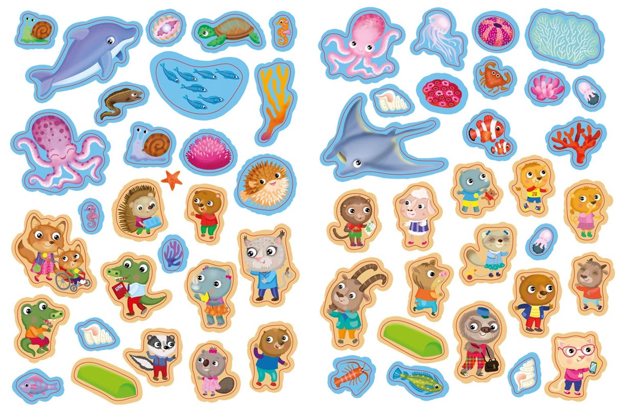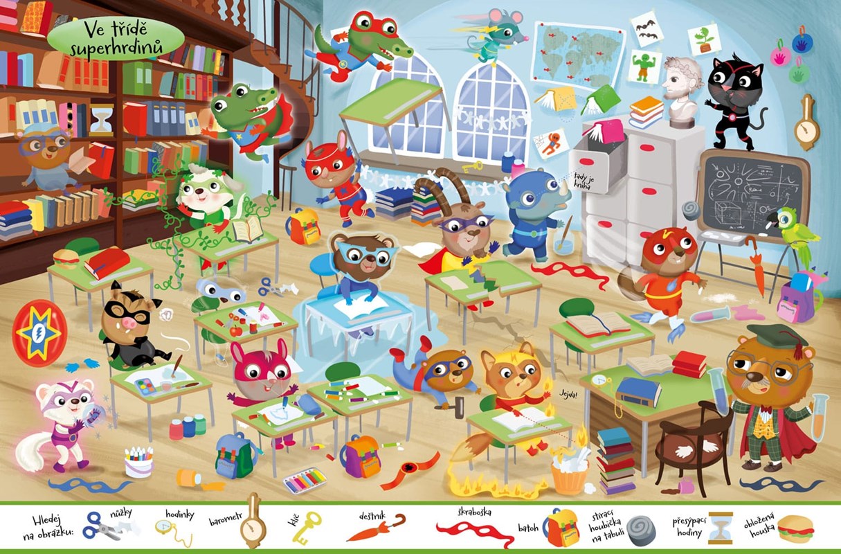 Zábavná kniha plná postav a předmětů, které je třeba hledat. Co se děje v bance, aquaparku, městském parku, školce, třídě superhrdinů, dobrodružném parku, na horách, kluzišti a farmě? Na konci knihy se nacházejí odpovědi hledaných předmětů. Knížka kromě 50 nálepek také obsahuje veselé obrázky pro vymalování.