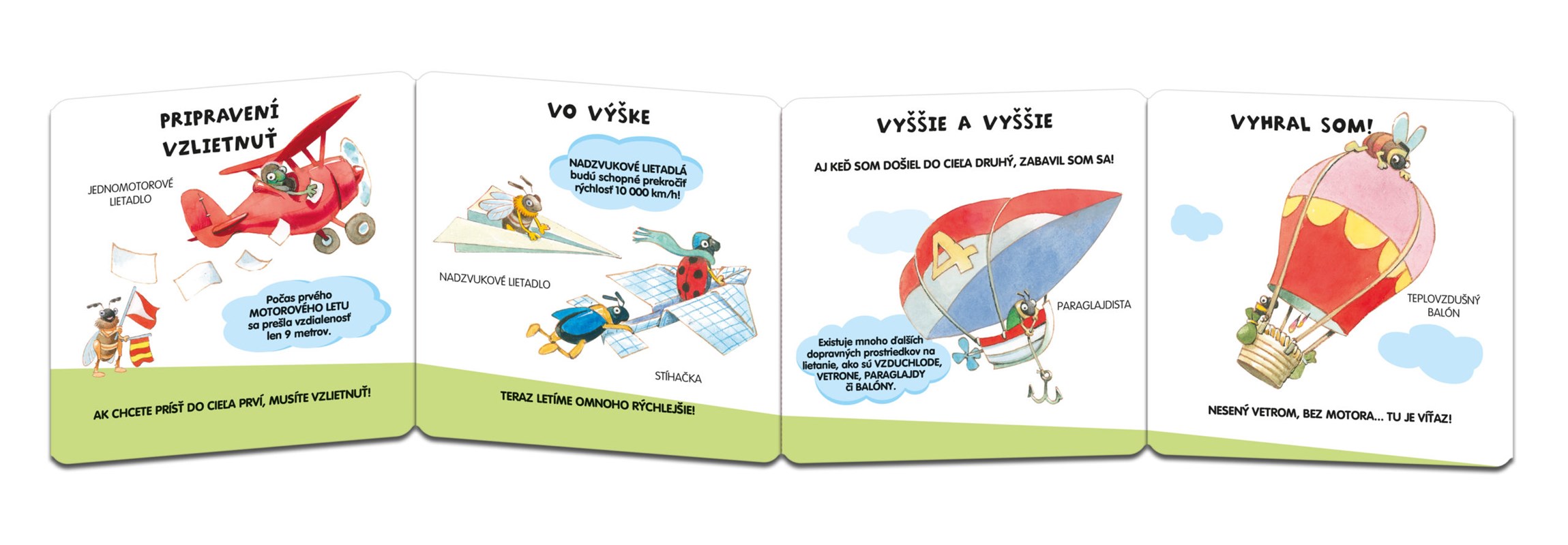 Rozkladacie harmonikové leporelo dlhé asi meter a pol zoznamuje deti s dopravnými prostriedkami, veselými obrázkami a poučnými textíkmi. Ktorý chrobáčik bude v cieli prvý? Dieťa spozná dopravné prostriedky ako kanoe, plachetnica, ťažné kone, tricykel, trojkolka, skejtbord, kolobežka, tandem, velocipéd, fúrik, džíp, sulka, kočiar, lokomotíva, vlak, lietadlo, teplovzdušný balón a iné. Určite si dieťa zapamätá zaujímavosti ako napríklad, že prvé autá v histórii boli tricykle, alebo že slimákovi trvá 1 minútu prejsť jeden meter! Knižku ilustroval Tony Wolf, preto sa deti môžu tešiť na veselé a hravé obrázky.
