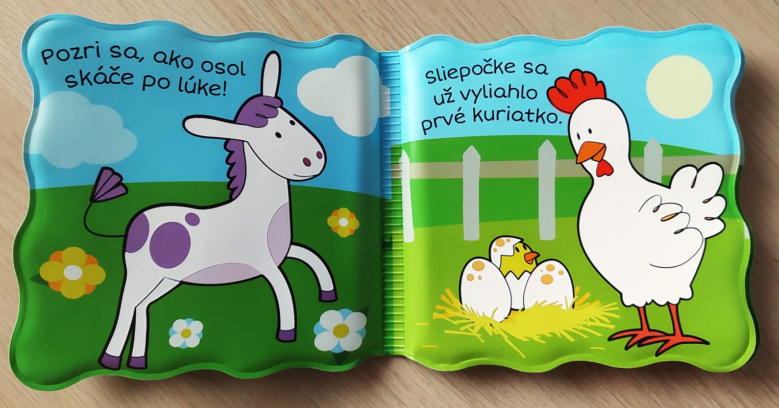 Séria Knižka do kúpeľa prináša deťom zábavu z vyfarbovania zvieratiek vodou! Krokom ku spríjemneniu chvíľ deťom počas kúpania je možnosť zabaviť ich leporelom. Nie však hocijakým, ale takým, ktoré sa rozžiari farbami po styku s vodou alebo so slinami. Alebo stačí pohár s vodou a drobné pršteky môžu kúzliť vodou priamo prechádzaním stranu po strane. O svojich drobcov sa nemusíte báť, pretože dané knižočky majú EÚ certifikát o zdravotnej neškodnosti. Môžu knihu močiť vo vode i olizovať, dokonca aj vtedy na nich spod obrázka vykukne farebné zvieratko. Veselé kúpacie leporelo s farmárskymi zvieratkami, ktoré si môžu vyfarbiť vodou (kačičky, ovečky, osol, sliepočka, prasiatko, kôň).