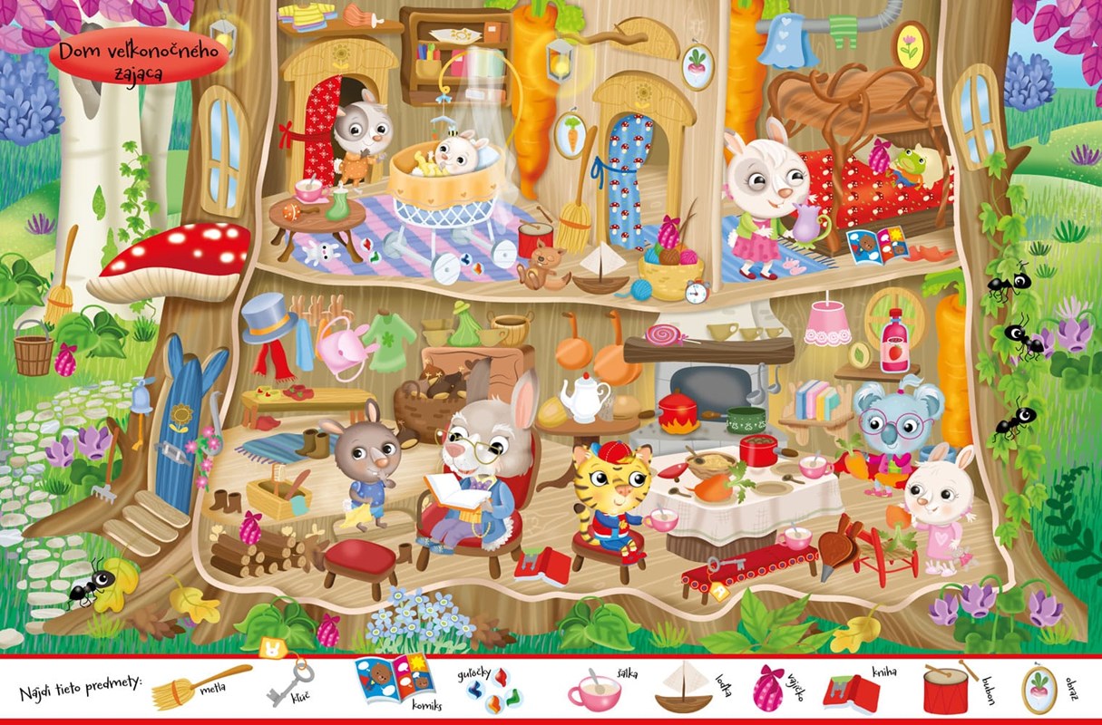 V jedno slnečné jarné ráno si koala Ela, tigrík Fred a žabiak Kvak-kvak našli v poštovej schránke netradičný list s dvoma bielymi ušami. Boli zvedaví, kto im píše. Po prečítaní listu zistili, že ich veľkonočný zajac pozýva na návštevu do Zajačej krajiny. Kamaráti sa veľmi potešili, neváhali a vyrazili na cestu. Pridaj sa k nim a otáčajúc stranu po strane hľadaj a nájdi rôzne predmety z obrázkov čokoládovne, výrobne cukríkov či zo záhrady veľkonočného zajaca. Zároveň hľadaj na každej dvojstrane troch roztomilých hlavných hrdinov.