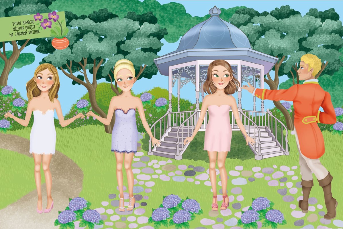 Chystá sa plesová sezóna a každá princezná sa chce páčiť. Krásna a elegantná alebo trošku extravagantná? Pomôž dievčatám vykúzliť z nálepiek tie najkrajšie plesové róby. Aj záhradná párty je dôvod krásne sa obliecť. Skutočná princezná je vždy elegantná a pripravená zažiariť. Samozrejme, nesmie chýbať korunka, šperky a šaty zdobené drahými kameňmi. Navrhni originálny outfit pre princezné a zažiar nie len s korunkou, ale aj kráľovským zmyslom pre štýl. Pomocou nálepiek vytvor množstvo jedinečných módnych oblečení. Nauč sa názvy látok, odevov a doplnkov na rôzne príležitosti. Zaži veľa zábavy tvorením nových kúskov.