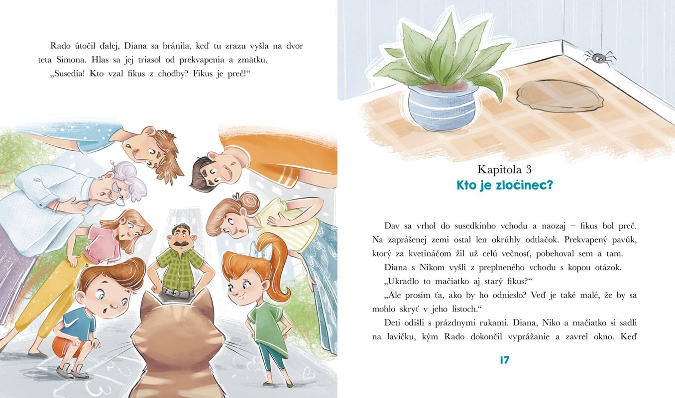 Diana a Nikolas si nikdy nemysleli, že sa môžu stať detektívmi. Keď však susedovi Radovi zmizne rezeň priamo z parapetu okna, čo spustí sériu zmiznutí ďalších vecí, Dia a Niko sa púšťajú do vyšetrovania! Kto by kradol fikus, mrkvu či dokonca papagája? Podarí sa im odhaliť a chytiť zlodeja? Malí detektívi to dokážu jedine spoločnými silami. Pridajte sa k šesťročným vyšetrovateľom a vyriešte záhadu spolu s nimi.