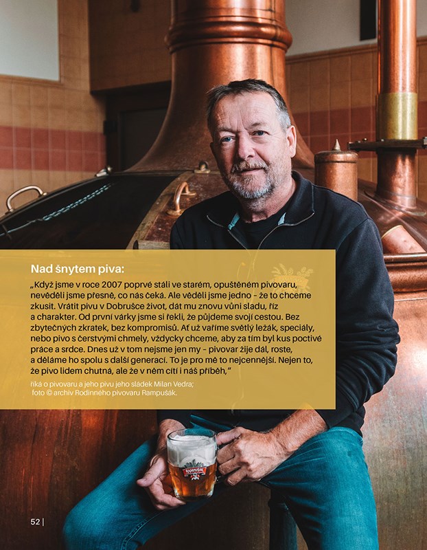 Titulů o českých a moravských pivovarech už vznikla celá řada. Tento, který právě držíte v ruce, je ale jiný. Autor, Filip Vrána, je poradcem Českého svazu pivovarů a sladoven při zapsání české pivní kultury na světové dědictví UNESCO. Podnětem ke vzniku bylo zjistit, které pivovary jsou vlastně těmi hlavními nositeli českých tradic. V knize jsou tak podniky, které fungují minimálně sto let. Kromě textové části pojednávající o historii i současnosti pivovarů jsme požádali sládky, aby napsali, v čem je jejich pivovar výjimečný právě s ohledem na historii. Ostatně, kdo jiný by to měl vědět lépe… Zároveň díky knize nakouknete i do pivovarnických míst, kam byste se běžně nedostali.