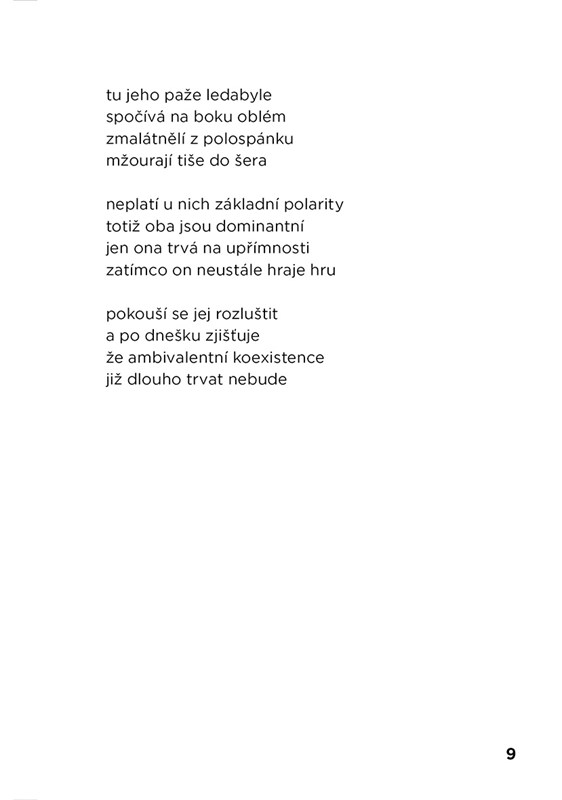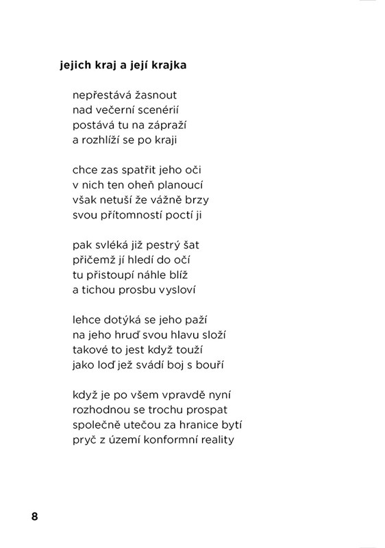 Tematicky různorodá poetická sbírka zachycující poslední třetinu autorčiny dosud dvaadvacetileté existence, jejímž společným jmenovatelem jsou procesy nitra spuštěné na pozadí každodenního dění.