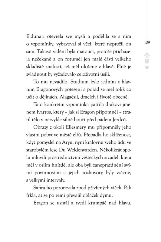 Už je to rok, co Eragon opustil Alagaësii, aby vyhledal vhodný domov k založení nové generace Dračích jezdců. Teď se potýká s nekonečnou záplavou úkolů: výstavbou velké pevnosti, dohadováním s dodavateli zásob, hlídáním dračích vajec, jednáním s bojovnými urgaly a povýšenými elfy. Vytržení z každodenní rutiny však nabídne vidění Eldunarí, nečekaná návštěva a také vzrušující urgalská pověst, jež mnohé změní...