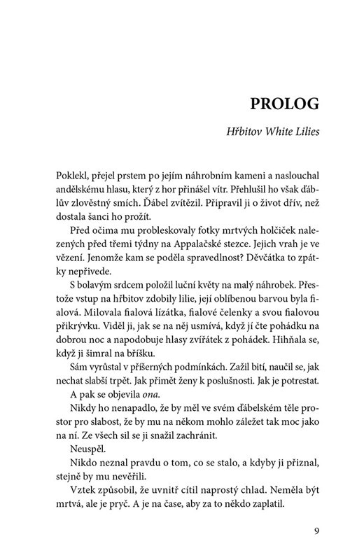Detektiv Ellie Reevesová se vydá na túru v Appalačských horách, když narazí na mrtvé tělo. Se soumrakem se zvedne poryv větru, který zavane na Elliinu stezku okvětní lístky. Když se vydá po jejich stopě, najde mrtvou mladou ženu se zlatými vlasy, ležící na lůžku z narcisů, a vedle ní lístek se vzkazem: Pondělní dítko má překrásnou tvář.