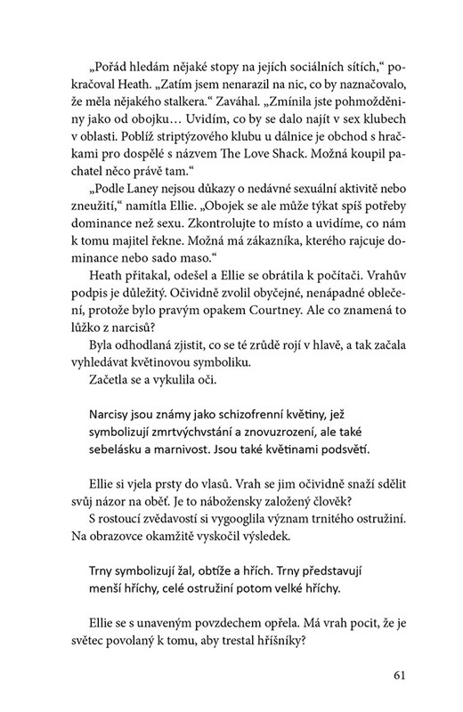 Ellie stojí proti sériovému vrahovi, který si vyžádá jednu oběť pro každý den v týdnu. Během následujících čtyřiadvaceti hodin se prokáže další vražda a když dojde k vloupání do jejího domu a po podlaze najde rozházené okvětní lístky narcisů, je jasné, že se cílem nemilosrdného vraha stala samotná Ellie. Dokáže zachránit další nevinné ženy? Nebo se k ní dostane dřív?